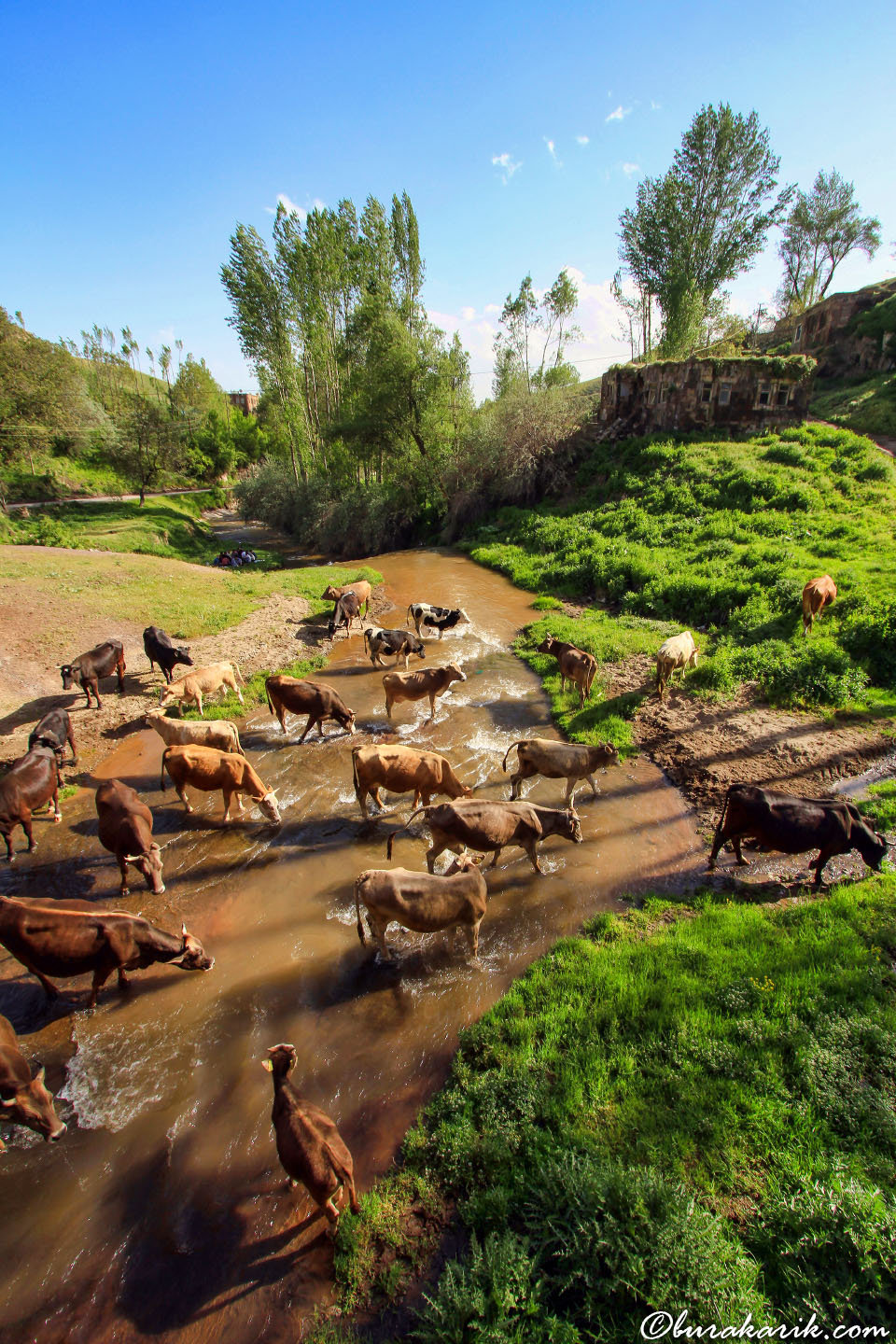 I captured this serene image in Ahlat, Bitlis, where a group of cows move leisurely through a shallow river. The lively green grass and towering trees frame the scene beautifully, making it an idyllic depiction of rural life. As I stood there, the sound of the water flowing gently and the rustle of leaves created a peaceful ambiance. The lighting was perfect; the sun bathed the landscape in a warm, golden hue, emphasizing the textures and colors vividly. The clear blue sky provided a stunning backdrop that added depth to the composition. I was drawn to the harmony of the natural elements with the historic remnants visible on the right. These ruins silently tell a tale of a bygone era, sitting there as witnesses to the continuous cycle of nature and time. The balance between the soft curves of the terrain and the stark elevation of the structures adds an interesting dynamic. It's a place where history and nature coexist, offering tranquility and a glimpse into the past. This photograph encapsulates an essence that is both timeless and reflective, inviting viewers to pause and appreciate the simple beauty of life's daily rhythm.
