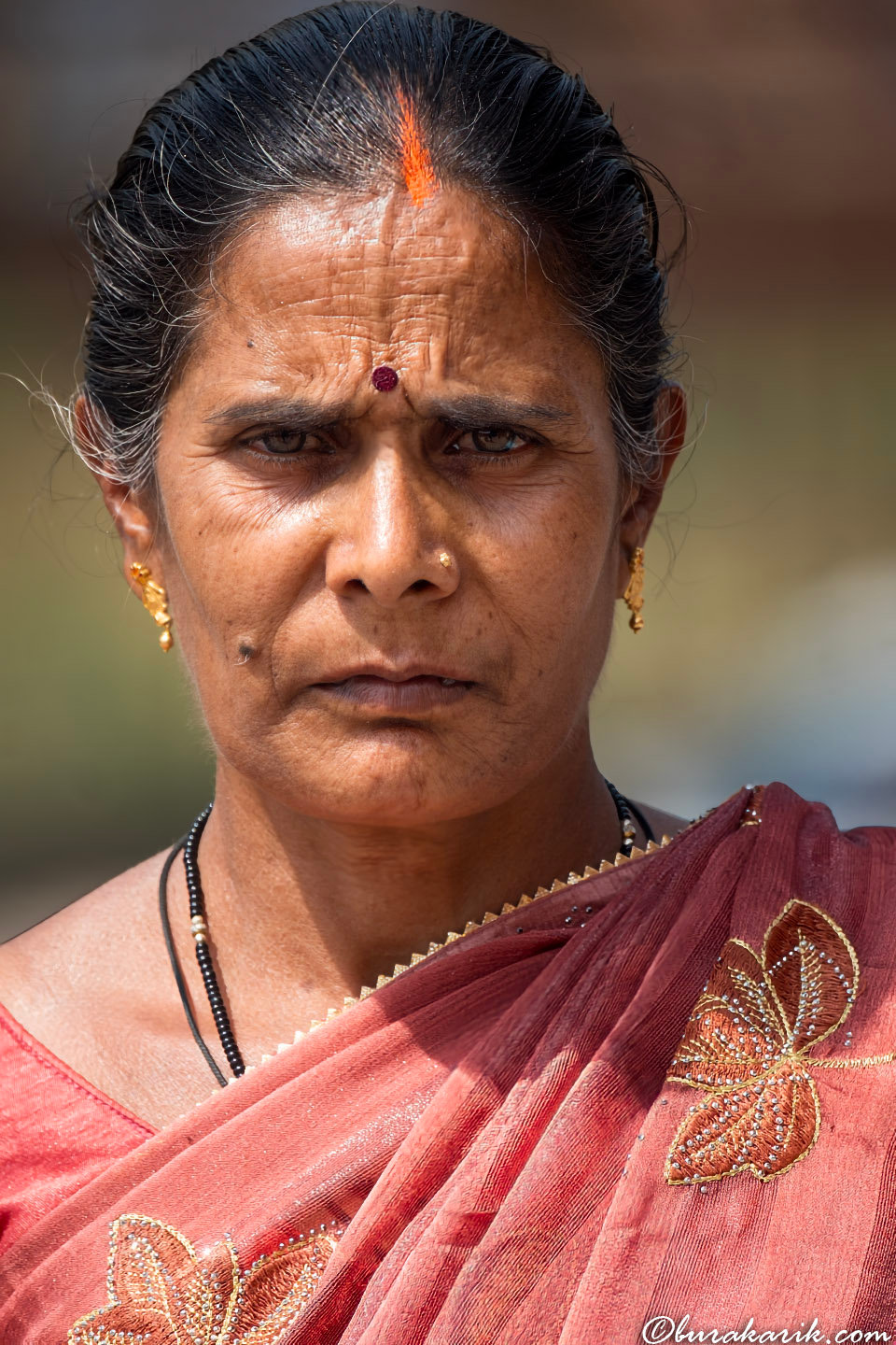 What caught my eye almost immediately was the bold streak of sindoor running along the parting of her hair—from her forehead deep into her scalp. I knew then that I was photographing a married Hindu woman, and this vivid vermilion mark wasn’t just symbolic—it was sacred. Sindoor is traditionally applied by a husband during the wedding ceremony and then worn daily as a sign of marital devotion. It rests upon the maang, or hair parting, which is considered the seat of spiritual energy—the ajna chakra. In that instant, I realized I wasn’t just capturing color—I was documenting an act of faith, love, and continuity.
