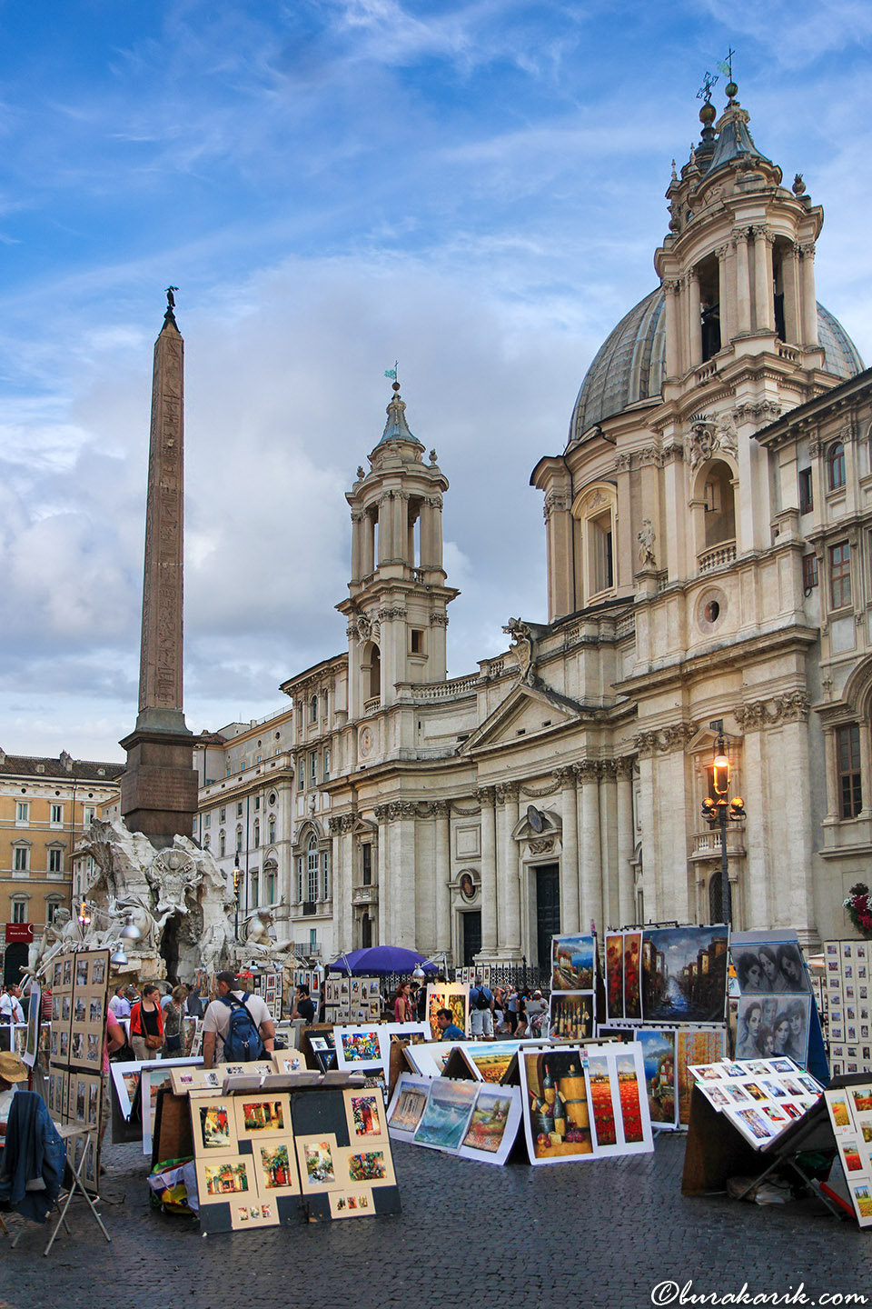 I took this photo at the bustling Piazza Navona, a lively square in the heart of Rome. The sky was beautifully adorned with scattered clouds, adding a perfect contrast against the striking architecture of Sant'Agnese in Agone church in the background. The church, an outstanding example of Baroque style, was originally designed by the famous architect Francesco Borromini in the 17th century. In the foreground, you can see the lively art market filled with vibrant paintings and photographs, providing a colorful tableau that added a dynamic atmosphere to the historic Piazza. The famous Fontana dei Quattro Fiumi, sculpted by Bernini, is also partially visible, crowned by the ancient Egyptian obelisk. The evening light gently illuminated the scene, allowing the warm colors of the artworks to contrast beautifully with the stone facades. Piazza Navona, built on the ancient Stadium of Domitian, offers visitors a unique blend of art, history, and culture, a place where past and present effortlessly intertwine.
