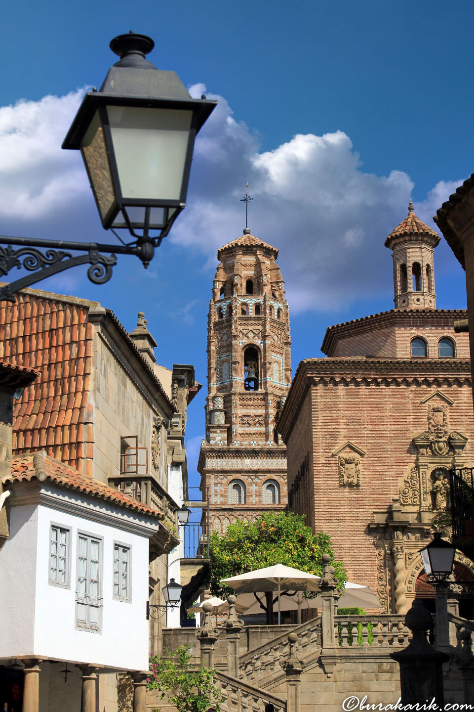 I took this photo at Poble Español, a unique architectural museum in Barcelona, that beautifully encapsulates Spanish heritage. The image captures a striking section of the open-air museum which features a blend of architectural styles representing diverse regions of Spain. The prominent structure in the center is a tower inspired by the Baroque and Gothic influences that are ubiquitous in Spanish architecture. The details on the brickwork showcase intricate designs that are both historical and visually captivating. In the foreground, there is an elegant street lamp that adds classic charm to the scene. The vibrant blue sky provides a stunning backdrop, highlighting the warm tones of the buildings, and bringing out the textures of the stone and brick. The atmosphere is serene yet rich with cultural depth. Poble Español was constructed in 1929 as part of the International Exhibition in Barcelona, and it has since become a beloved spot for both locals and tourists. Photographing this area gives me a sense of traveling through time and space, experiencing the essence of Spain in one place.