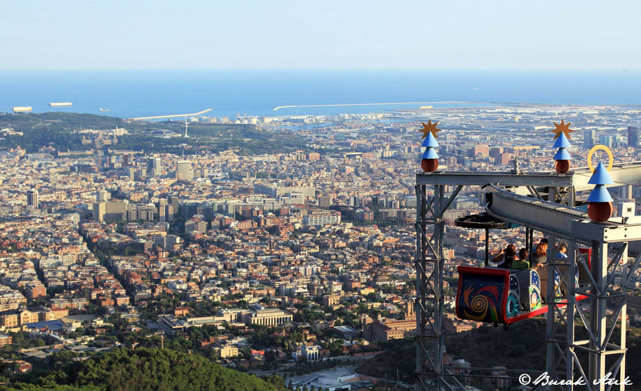 During my visit to the vibrant city of Barcelona, I captured this breathtaking image from the Tibidabo Amusement Park, perched majestically atop Mount Tibidabo. In the foreground, the iconic Ferris wheel offers a splash of color against the city's landscape, symbolizing the park’s nostalgic allure. The background unveils an expansive view of Barcelona, stretching out towards the shimmering waters of the Mediterranean Sea. The sprawling cityscape is a dazzling patchwork of historic and modern architecture, vividly painted by the setting sun. The image beautifully balances urban density with the tranquility of nature visible in the distant hills. Tibidabo, known for being one of the oldest amusement parks in the world, carries a rich slice of history dating back to its opening in 1901. It has been a beloved destination for locals and tourists alike, known not only for its adventurous rides but also for its panoramic vistas. The softly glowing sunlight creates subtle contrasts and highlights across the city, enriching the visual depth and encapsulating the lively spirit of Barcelona. This photograph, framed with an openness that invites endless exploration, perfectly captures the charm and energy of this unique location, making it a cherished memory of my journey.