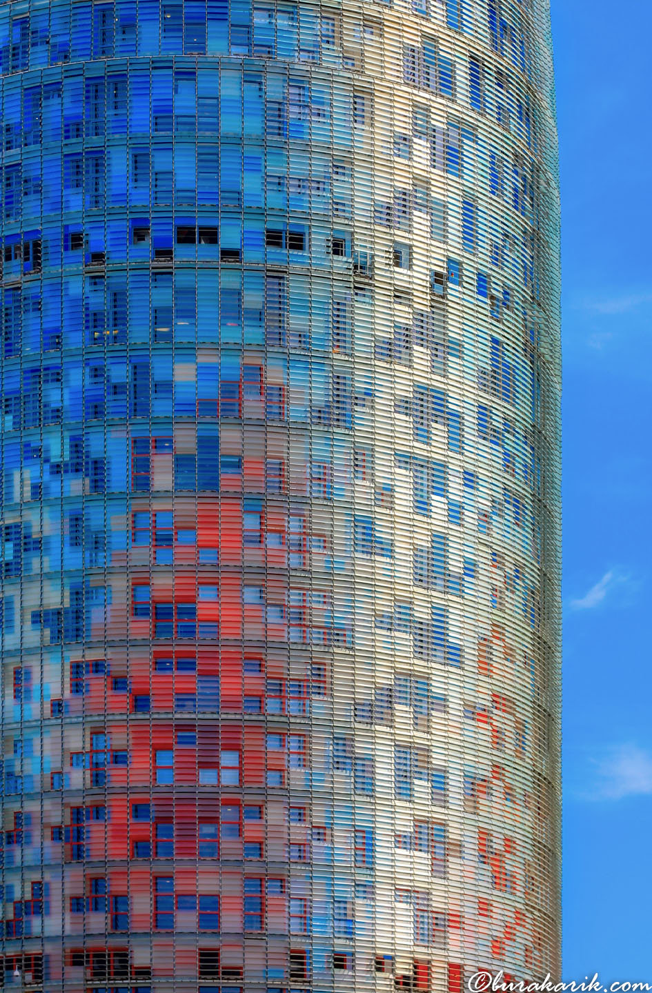 I captured this image on a bright and sunny day in Barcelona, showcasing the stunning facade of Torre Agbar. The building's unique design incorporates a wide range of colors, from blues to reds, which reflect beautifully in the daylight. The tower, designed by Jean Nouvel, is one of the most iconic skyscrapers in the city, known for its bullet-shaped structure. Standing at 144 meters tall, it has become a symbol of modern architecture in Barcelona since its completion in 2005. As I positioned my camera, I focused on the captivating interplay of light and color across the panel-covered exterior. The clever use of materials creates a shimmering effect that changes throughout the day, an aspect that I tried to capture in this photograph. This composition highlights the intricate details of the building's surface, each panel slightly angled to catch the light differently. Watching how the structure interacts with the clear blue sky inspired me to frame the shot with a skyward perspective, emphasizing its towering presence. This photo is a homage to Barcelona's architectural innovation and vibrant urban landscape.