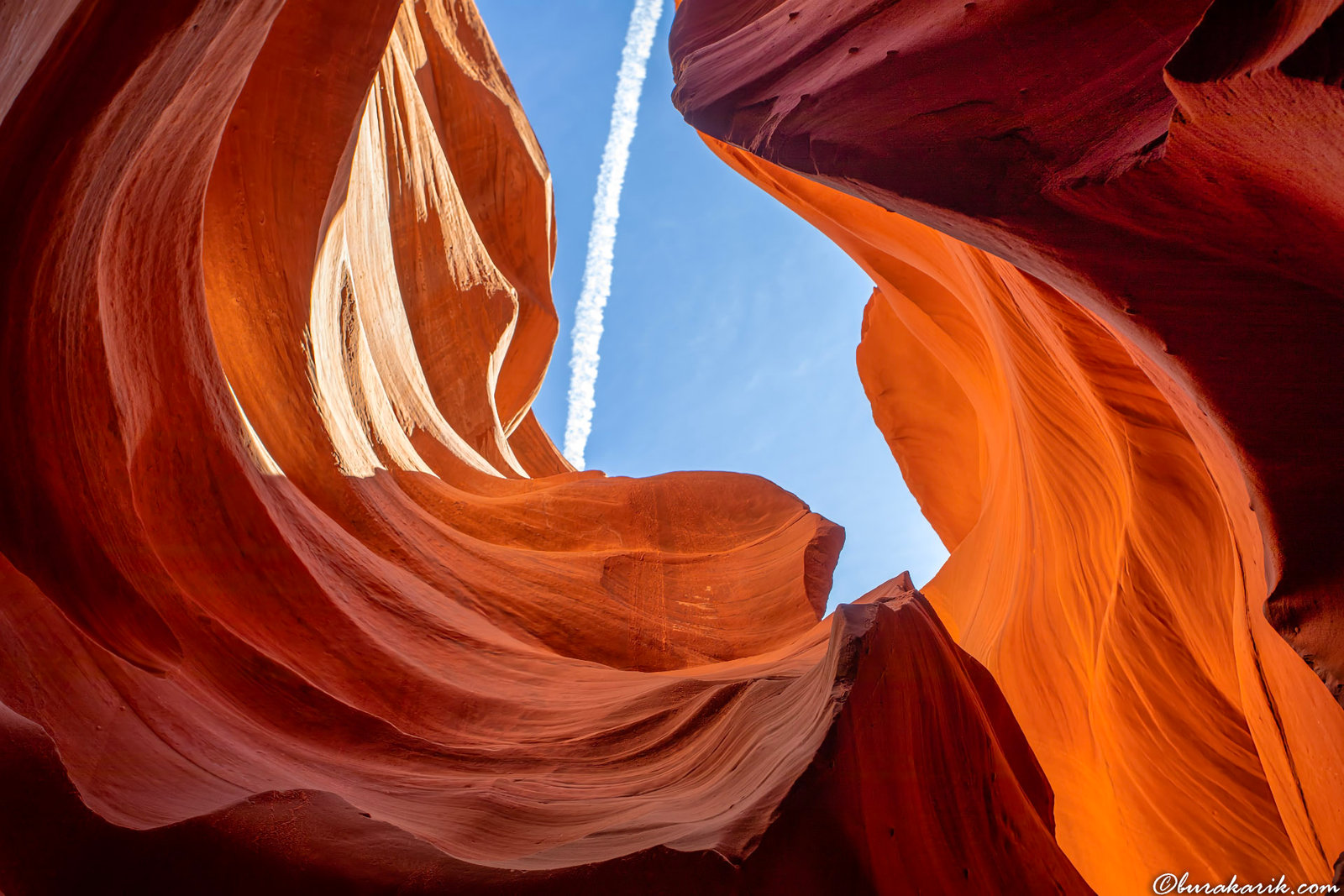 Bu göz alıcı fotoğrafı 'Antilop Kanyonu'nun Kıvrımları' başlığıyla Arizona'nın ikonik yarık kanyonlarında yaptığım macera sırasında çektim. Görüntü, parlak mavi bir gökyüzü şeridiyle çarpıcı bir tezat oluşturan kırmızı ve turuncu kumtaşının canlı tonlarını gösteriyor. Bu doğal heykel, birkaç bin yıl boyunca su erozyonu ile yontulmuş ve bu muhteşem dalga benzeri oluşumları ortaya çıkarmıştır. Orada dururken, ışığın pürüzsüz kaya yüzeylerinde nasıl oynadığını ve her kıvrımı ve dokuyu ayrıntılı bir şekilde vurguladığını görmek beni etkiledi. Dar kanyon duvarları fotoğrafçılar için benzersiz bir zorluk yaratıyor, ancak ışık tam olarak doğru şekilde vurduğunda sonuç muhteşem oluyor. Bu çekimi yaparken özel filtreler kullanmadım, ancak üstteki açıklıklardan süzülen doğal ışığa güvendim. Antilop Kanyonu, Navajo Ulusu'na aittir ve önemli kültürel öneme sahiptir, bu da deneyimime başka bir takdir katmanı ekliyor. Orada yapılan her keşif, ışığın gün boyunca renkleri ve gölgeleri değiştirmesiyle yeni bir keşif gibi hissediliyor.