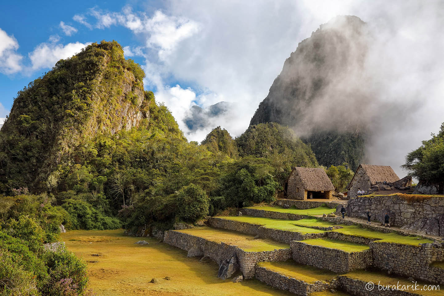 Machu Picchu'nun uzak köşesinde yer alan bu basamaklı yapılar, İnkalar tarafından bir ARGE labratuvarı olarak kullanılıyormuş. Her basamakta yer alan özellik bakımından birbirinden farklar içeren topraklarda farklı bitkiler yetiştirilmeye ve verim artırılmaya çalışılıyormuş. Arka tarafta gördüğünüz kulübeler ise Huayna Picchu 'ya devam edecek izciler için dinlenme noktalarıymış.