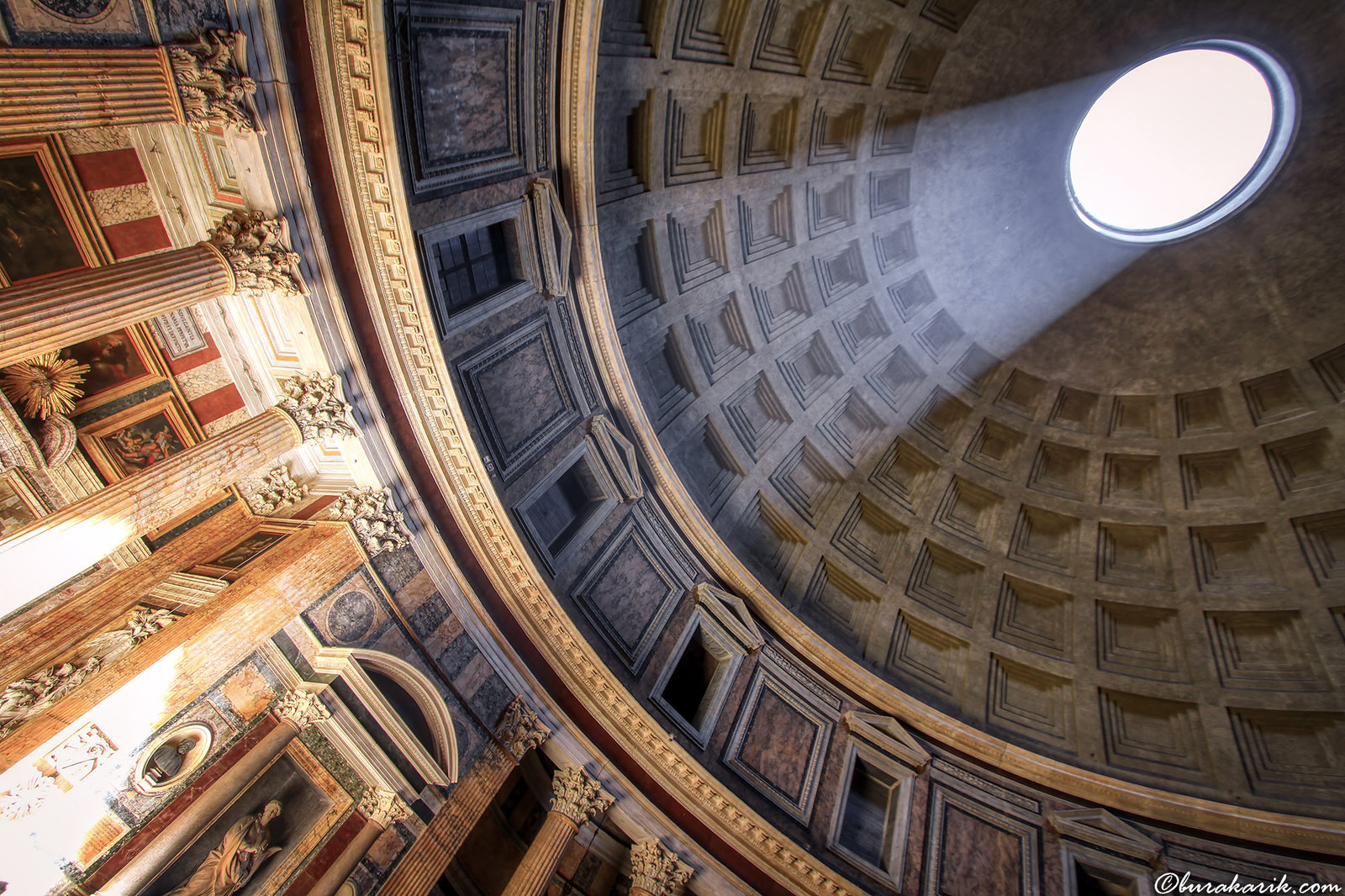 Bu fotoğraf Roma'daki Pantheon'un çarpıcı iç mekanını, antik Roma mimarisinin parlaklığını gözler önüne seriyor. Yukarıdaki büyük oculus, aşağıya doğru muhteşem bir ışık hüzmesi gönderiyor ve içinde hayranlık uyandırıcı, manevi bir atmosfer yaratıyor. Güneş ışığının kasetli kubbenin karmaşık detaylarını ve aşağıdaki süslü sütunları nasıl aydınlattığını görmek beni etkiledi. Pantheon, Roma tanrıları için bir tapınak olarak inşa edilmiş ve M.S. 126 civarında İmparator Hadrian tarafından tamamlandığından beri zamana meydan okumuştur. Orada büyülenmiş halde dururken, ışık ve gölgelerin bu antik yapının sanatsal cazibesini nasıl tanımladığını gösteren kareyi yakalamak için kameramı kullandım. Tasarımdaki simetri ve orantı dikkat çekici; kubbe, yüksekliği genişliğiyle aynı olan dairesel duvarların üzerine mükemmel bir yarım küre olarak oturuyor. Şimdi bir kilise olarak hizmet veren bu mimari harika, tarihi ve mühendislik dehası ile hala bir mucize. Çektiğim her fotoğraf, bu ikonik anıtın içinde dururken hissettiğim hayranlık duygusunu korumayı amaçladı.