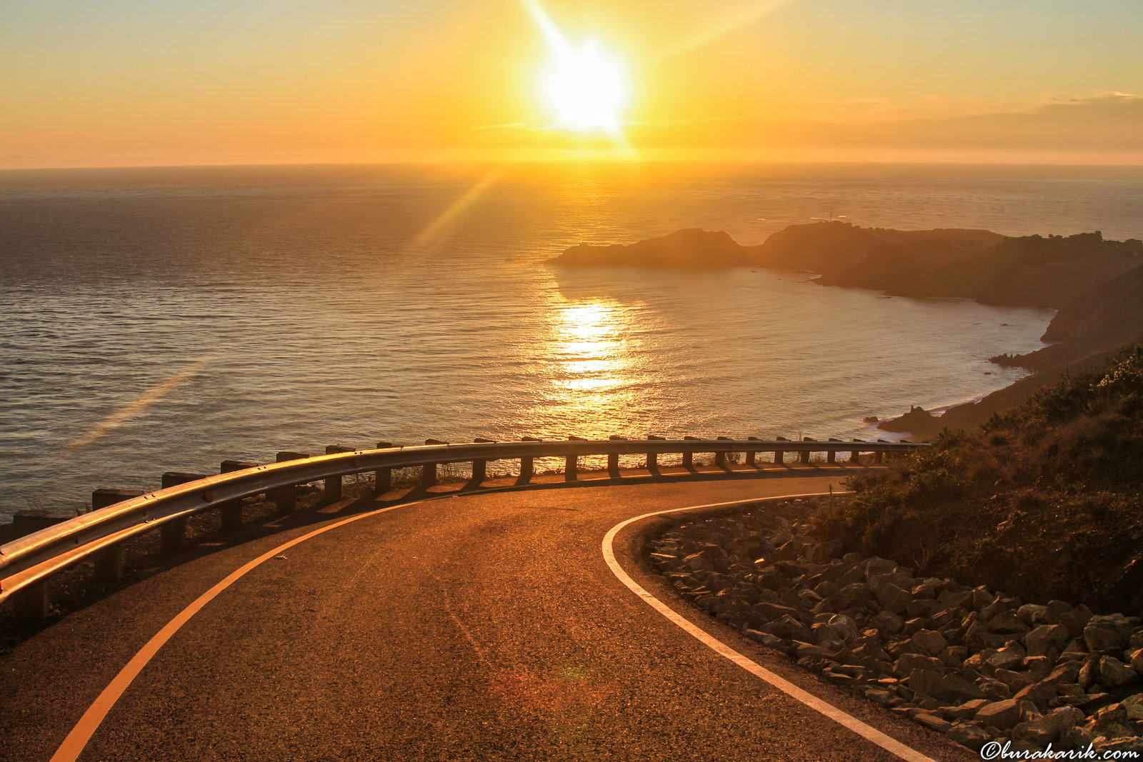 Pasifik Gün Batımı adlı bu muhteşem fotoğrafı, Pasifik Okyanusu'na bakan bir kıyı yolunda sakin bir akşamüstü çektim. Zamanlama mükemmeldi, tam da altın saat, gökyüzü ve deniz üzerinde sıcak, zengin bir parlaklık yaydığı sırada. Ufukta batan güneş, ressamın fırça darbelerini anımsatan canlı turuncu ve sarı çizgilerle suyu boyadı. Ön plandaki kıvrımlı yol, kompozisyona dinamik bir unsur katıyor, izleyicinin gözünü fotoğrafa ve parlak gün batımına yönlendiriyor. Korkuluk, derinliği ve perspektifi artıran doğal bir çizgi oluşturuyor, izleyiciyi bu tablo gibi sahneye doğru bir yolculuğa çıkacakmış gibi hissettiriyor. Fotoğrafik açıdan bakıldığında, çekimin düşük açısı yolun ve engebeli kıyının dokularını vurgularken, yumuşak ışık manzaradaki ince detayları öne çıkarıyor. f/8 diyafram açıklığına sahip bir DSLR kamerayı kullanarak, hem ön planı hem de uzak ufku keskin odakta yakalamayı başardım ve parlak güneşin manzarayı aşırı güçlenmesini önleyecek şekilde mükemmel bir şekilde dengeledim. Bu görüntü, doğanın sükunetinin ve sahildeki gün batımının büyüleyici çekiciliğinin güzel bir hatırlatıcısıdır.