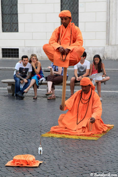 Bu fotoğrafı, Roma'nın kalbinde bulunan ünlü Piazza Navona'da çektim. Bu geniş meydan, Barok mimarisi ve canlı atmosferiyle tanınıyor. O gün, meydanın tam ortasında gerçekleşen bir illüzyon performansı beni büyüledi. Sokak sanatçıları, plazanın tekdüze taşlarıyla güzel bir tezat oluşturan canlı turuncu giysiler giymişlerdi. Sanatçının ana numarası, meraklı bir kalabalığı cezbeden karmaşık bir levitasyon illüzyonuydu. Performansçılar, sahneye mistik bir hava katan uzun bir sopayı kullanarak mükemmel bir denge sağladılar. Anı yakalamak için geri çekildiğimde, çeşitli izleyici grubu kompozisyonuma ilginç katmanlar ekledi. Arka planda, Saint Agnes in Agone kilisesinin berrak beyaz cephesi performansı harika bir şekilde çerçeveleyerek tarihi bir ihtişam kattı. Bu ilginç zanaatkarlık kombinasyonu, kültürel olarak zengin bir ortamın cazibesi ve parıldayan akşam ışığı, bu fotoğrafı Roma sokak yaşamının unutulmaz bir anı haline getirdi.